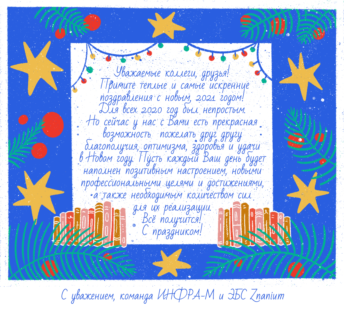 Уважаемый наш автор — настоящий и будущий! От имени всего коллектива группы компаний ИНФРА-М благодарим Вас за сотрудничество в 2020 году и за прекрасные учебники, которые заняли достойное место в линейке нашего издательства! Уверены, что в 2021 году наше взаимодействие продолжится и будет взаимопродуктивным. Дорогие новые авторы! Присоединяйтесь к нам в новом году! Со своей стороны мы делаем все для того, чтобы о Ваших трудах узнало как можно больше наших пользователей. Практика показывает, что наиболее успешными на рынке оказываются книги, в продвижении которых активно участвуют сами авторы. Поэтому напоминаем о простых действиях в этом направлении с Вашей и нашей стороны. | | | Расскажем всему миру о вашей работе! | | | Для тех, кто уже является автором ИНФРА-М | | | Сделайте пост в собственных соцсетях или соцсетях Вашего учебного заведения о выходе Вашей новой книги и сообщите об этом нам в ответном письме! Мы обязательно его репостнем в своих официальных пабликах: | | | Сообщите нам о различных конкурсах на лучший учебник или публикациях по грантам, а мы поможем с отправкой книг или оформлением заявки. Напоминаем, что для Вас, как для нашего автора, всегда действует скидка 20% на покупку литературы. Для ее получения Вам нужно зарегистрироваться на сайте ИНФРА-М по ссылке. Скидку можно оформить на себя, своих близких или друзей. | | | Присылайте нам небольшую рецензию на Вашу книгу и свое фото для специальной рубрики «Авторы» в наших соцсетях. | | | Мы знаем, как сделать так, чтобы Ваши книги (новые и ранее изданные) были всегда под рукой. Для этого нужно зарегистрироваться в ЭБС Znanium, после чего Вам откроется вечный доступ к Вашей литературе. А еще можно подарить новую жизнь Вашим ранее изданным книгам — мы разместим их в ЭБС Znanium! Подробности: goncharova_ai@infra-m.ru | | | Приглашаем к сотрудничеству новых авторов! | | | Для тех, кто планирует издать учебник и монографию, опубликовать статью