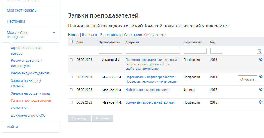 представлены заявки от преподавателей Вашего учебного заведения на включение в подписку необходимых им изданий.