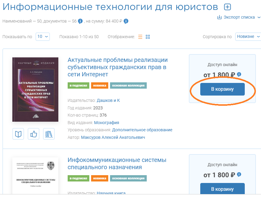 Если найденная необходимая литература не входит в подписку, Вы можете отложить ее в корзину и оформить отдельную покнижную подписку.