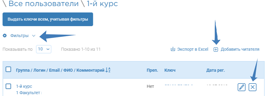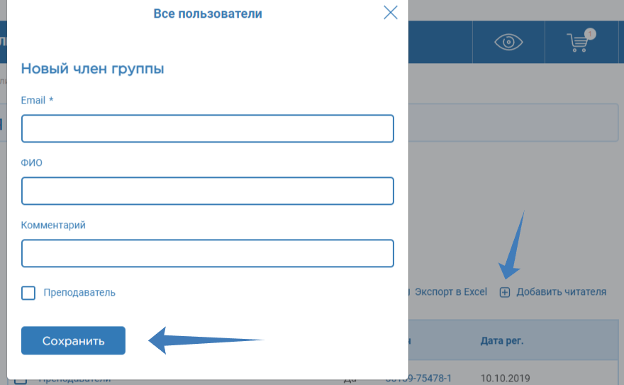 Чтобы добавить пользователя вручную, откройте список Все пользователи, нажмите на кнопкуДобавить читателяи заполните поля формы. Если необходимо, разместите дополнительную информацию о пользователе в комментарии и выставите чек-бокс Преподаватель.